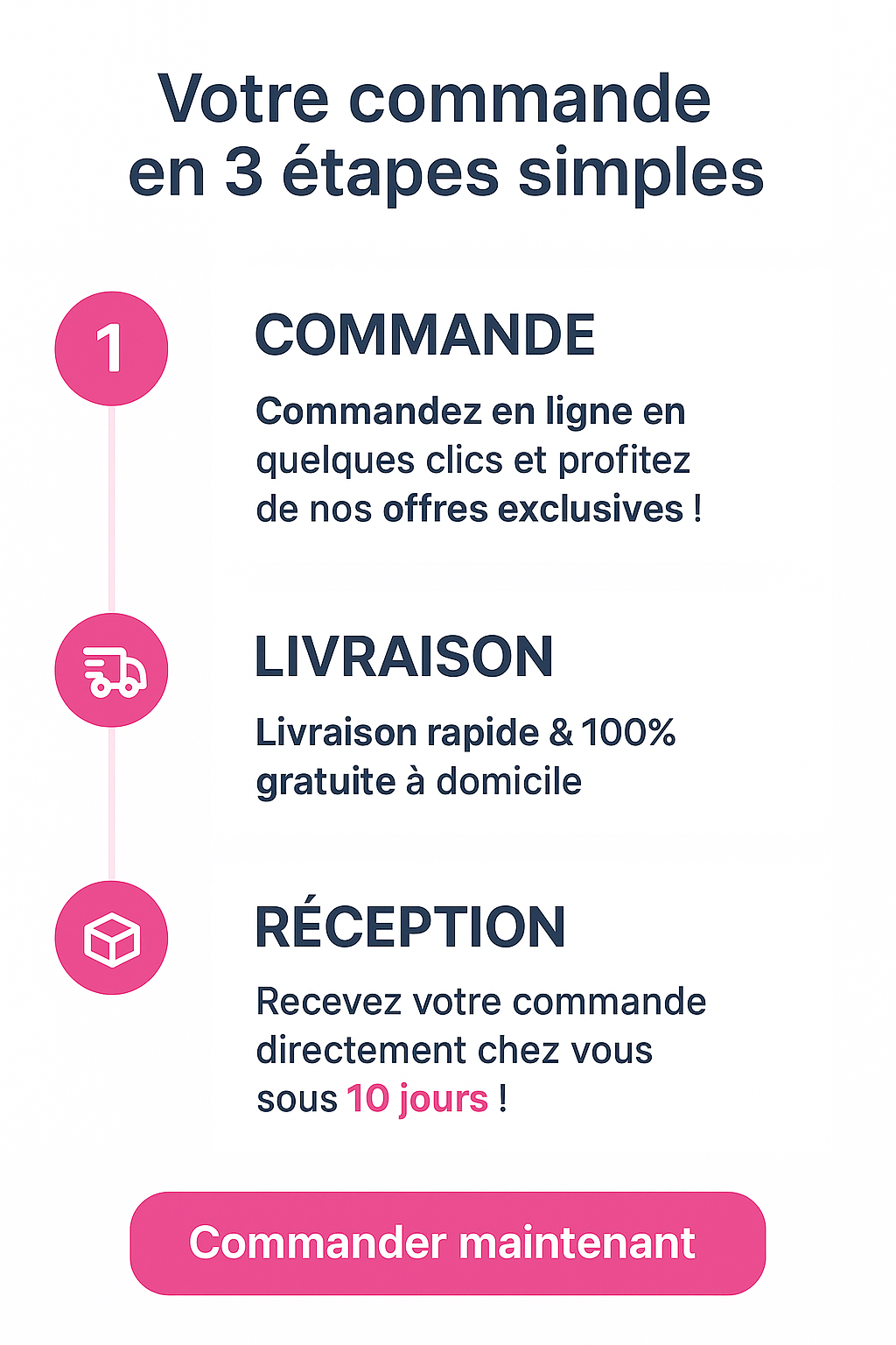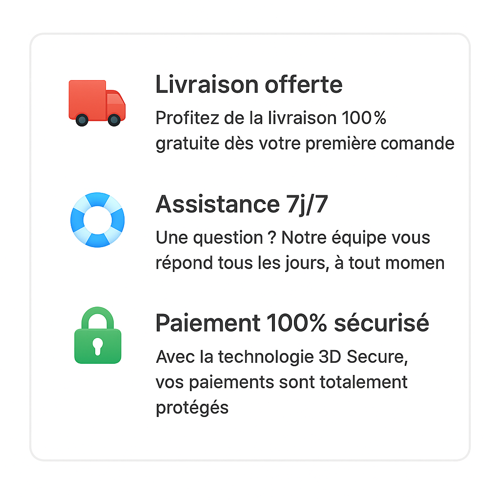 Nos produits sont expédiés rapidement et livrés sous quelques jours ouvrés. Chaque commande bénéficie d’un suivi pour une expérience d’achat simple et sécurisée.